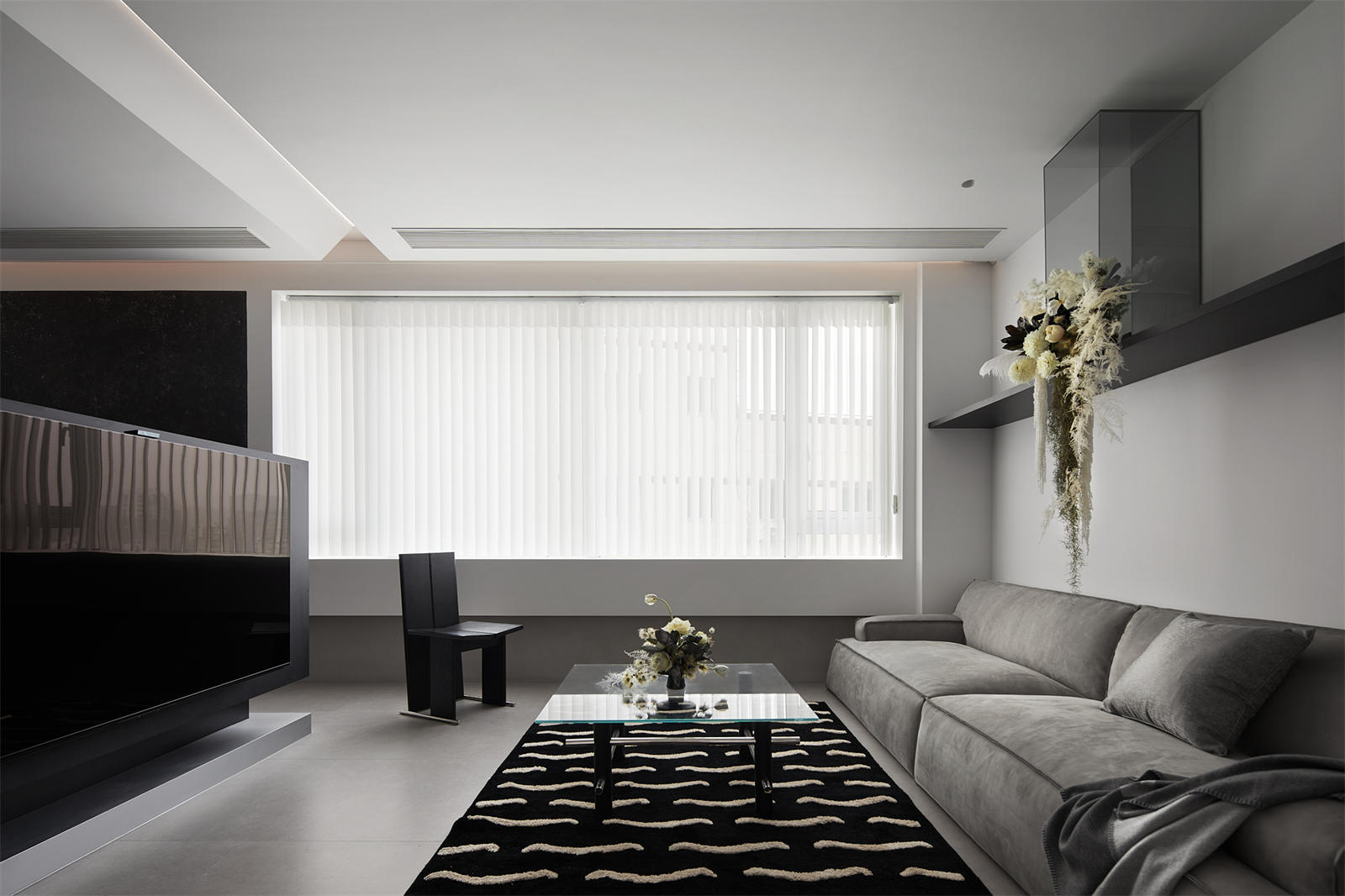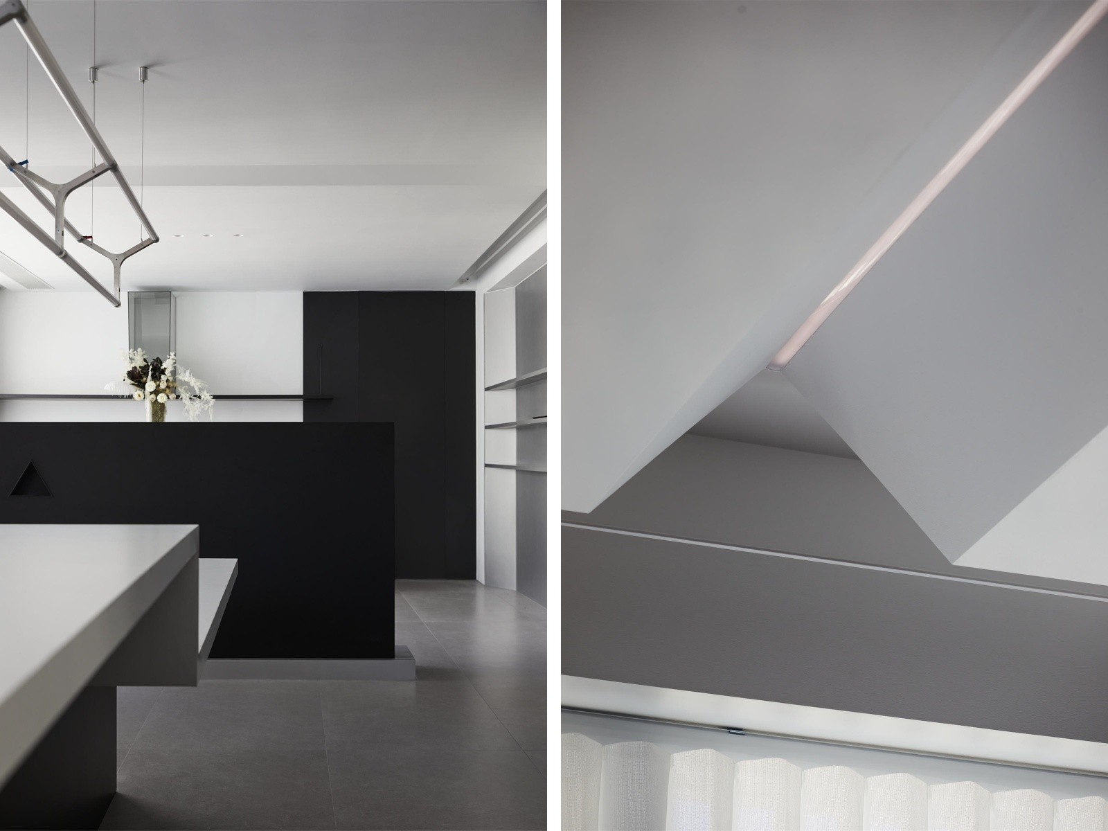 In addition to the low wall, the top of the space also makes a soft division of the space and runs through the space. This linear division highlights the sense of volume and makes the suspended ceiling space more interesting.Lines, blocks and surfaces form this long hall. The space is only soft divided by a low wall, and the living room, dining room and kitchen run north and south, recording every scene of family life together. Families can also interact freely across the low wall, and the free and open atmosphere flows in the space.