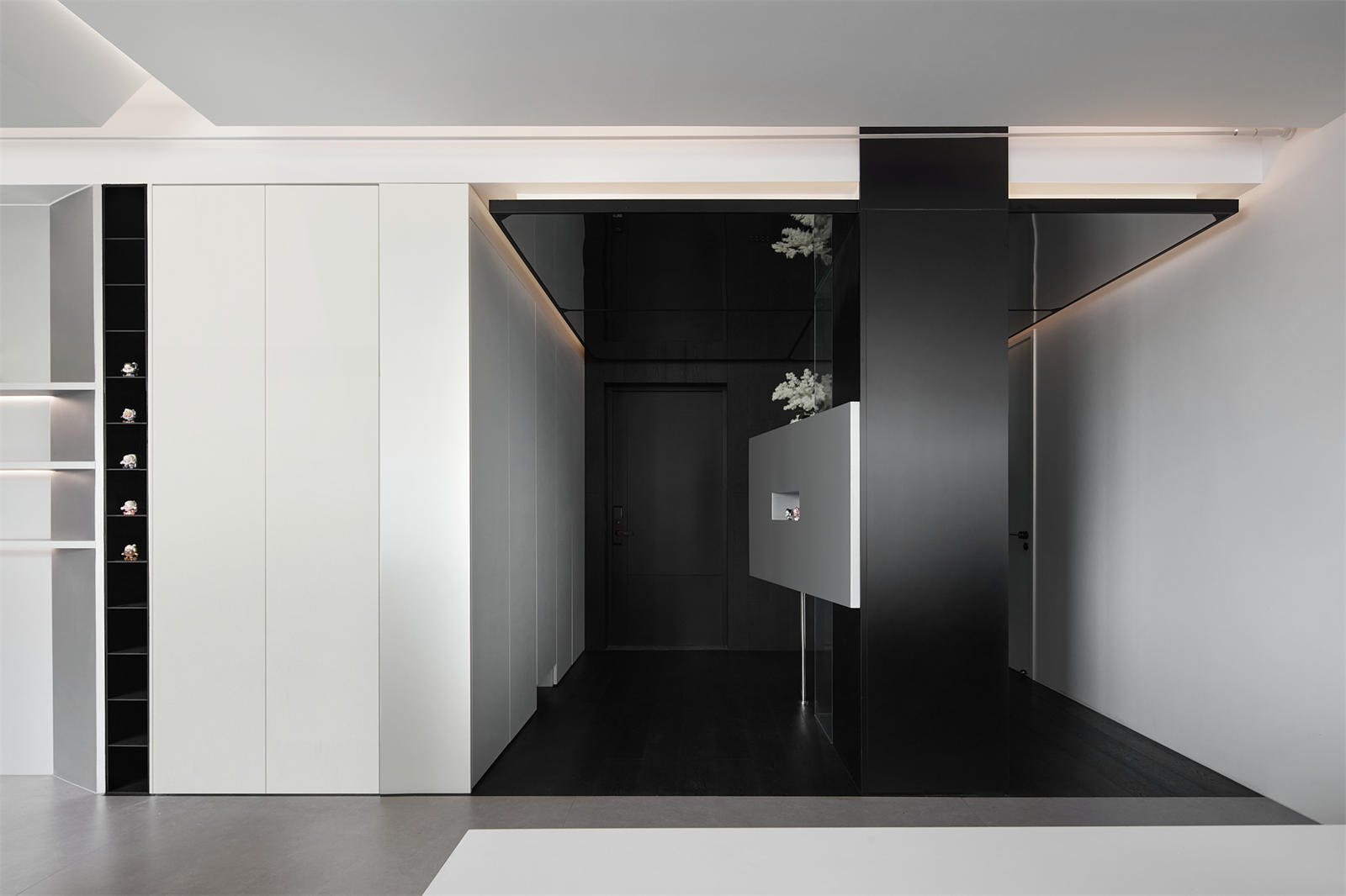If you can't remove a bearing column, use it. We built four boxes around the original building structure to display the owner's "older children". One of the oblique protruding faces the entrance, in order to solve the shortage of the original column position to one side, to achieve the visual effect of "opening the door to see the baby".The young people of Generation Z love freedom and exploration. They are more receptive and tolerant of different cultures. We created this project for a Generation Z couple who love trendy toys. Different from the ordinary porch space, the entrance of this home not only connects the internal and external space, but also assumes the function of hand display.