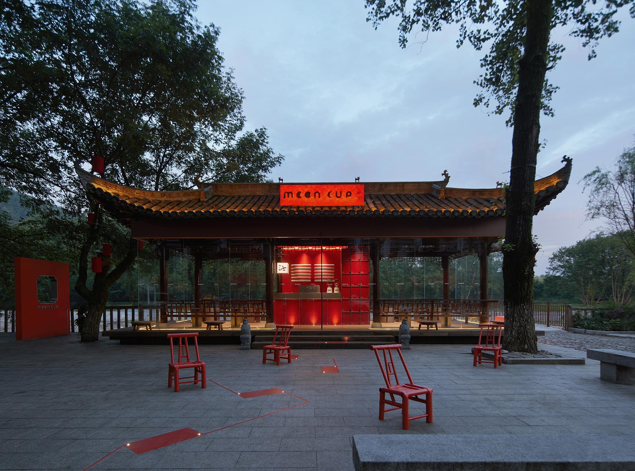 MOON CUP Cafe is located in the Moon Bay scenic spot in Xuancheng, Anhui province. With the geographic advantages of its god-given unique riverside region and its position as an important route point of the 318 South Anhui Sichuan-Tibet line, this scenic spot attracts tourists from all over the world. With a leisure square on the east side, and a flow path of Moon Bay on the west side, this project plot is adjacent to the entrance of the scenic spot, giving it extremely superior landscape resources. The original spatial carrier was a Hui-style landscape pavilion built by the proprietor’s elders, which has been designed and rebuilt into a complex commercial space with the functions of daytime coffee and night bar.With respect to the local style and features and the original architectural form, the design team achieved a fusion symbiosis between the old and new elements, environment and space with minimal intervention, making the pavilion a new focal point of the Moon Bay scenic spot. The proprietor runs a BBQ restaurant in the square beside the pavilion, adjusting his business strategies aiming at the customer group - adding the night drink function to the MOON CUP; realizing the cycle of two commercial activities.The architectural image of the Hui-style landscape pavilion has a strong Chinese style attribute. Therefore, in terms of design language, we combined Chinese-style and modern, local culture with the potential needs of the proprietor, spatially presenting the cultural inheritance rooting in this land in a lighter and more modern way.