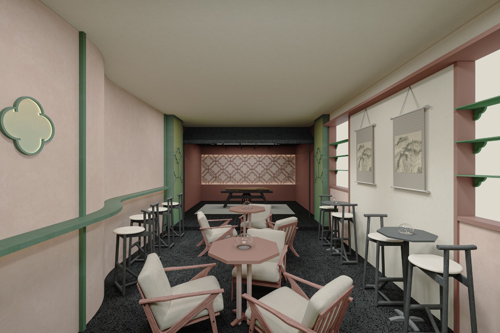 Extracting the Ruyi window lattice motif from classical Chinese gardens for spatial elements: the bar counter features a window lattice with a plantain, creating a framed view that evokes a living scene; the seating area is divided by vertical elongated windows to cultivate a meditative tea-drinking atmosphere. Additionally, the hollowed Ruyi pattern on the green door in the guest area and the pink-and-green Ruyi motifs adorning the tea tables echo the "Window Lattice Elegant Gathering" theme.