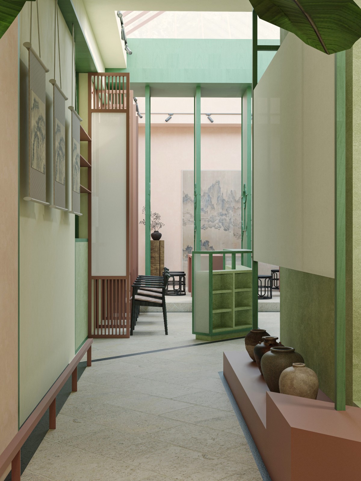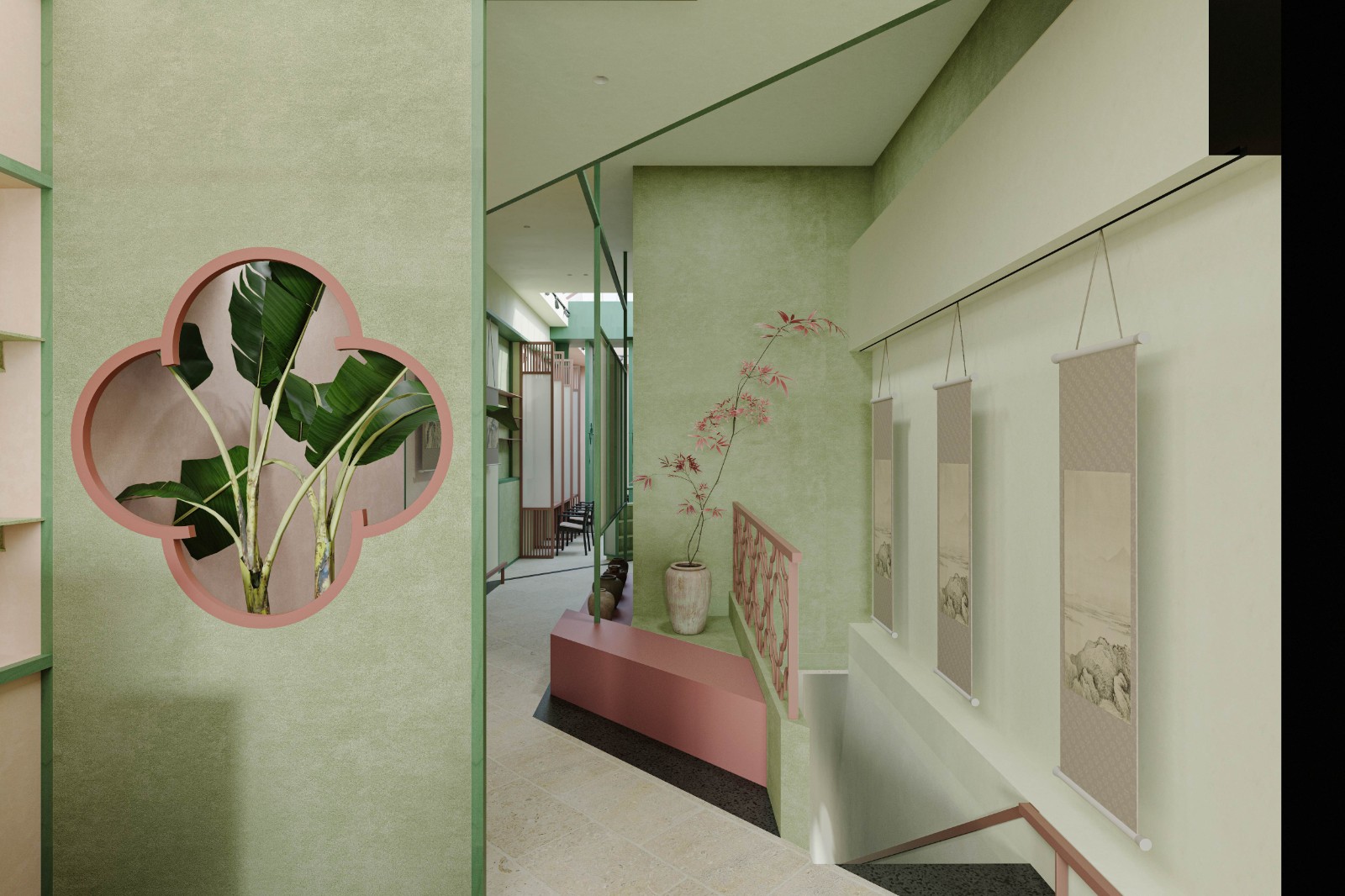 The overall space adopts a foundational palette of pink and green, inspired by the lotus, punctuated with ink black to evoke a natural and fresh ambiance.