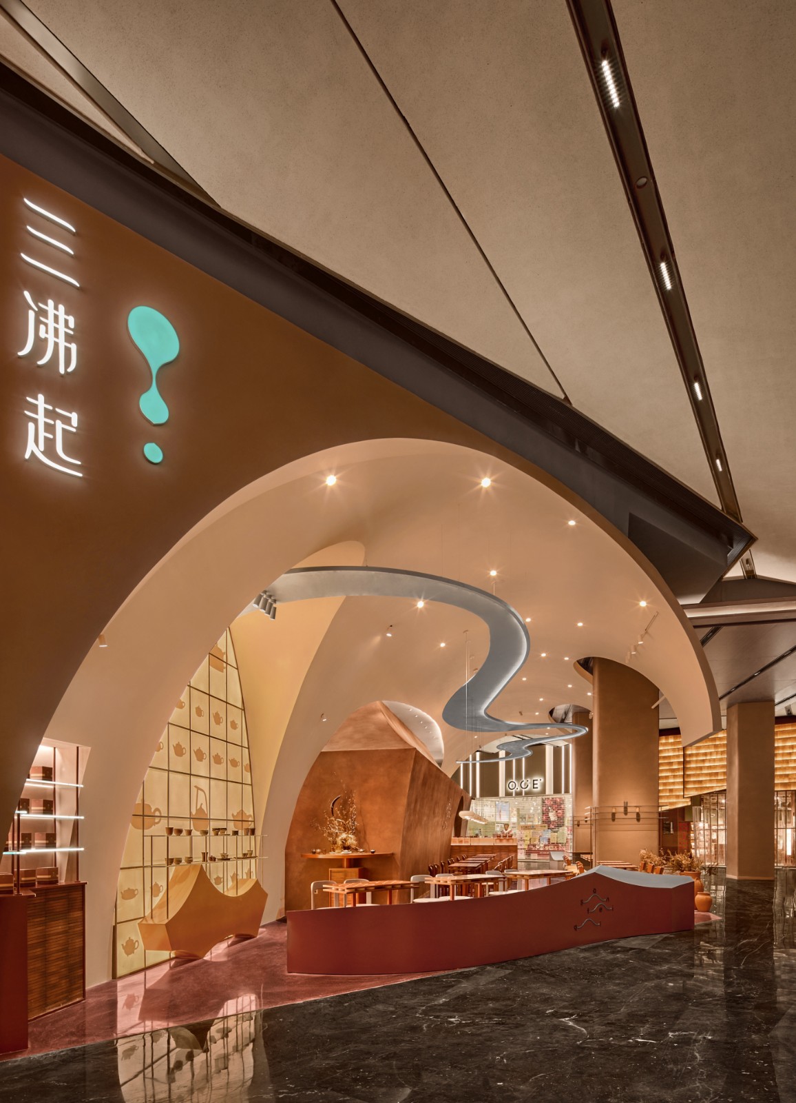 从宜兴龙窑遗址、窑炉、非遗紫砂壶、等在地文化中提取设计灵感,不规则的弧形天花模拟龙窑的形状,吧台则是对窑炉形式的转译,墙面采用紫砂壶剪影,将在地文化融入空间。