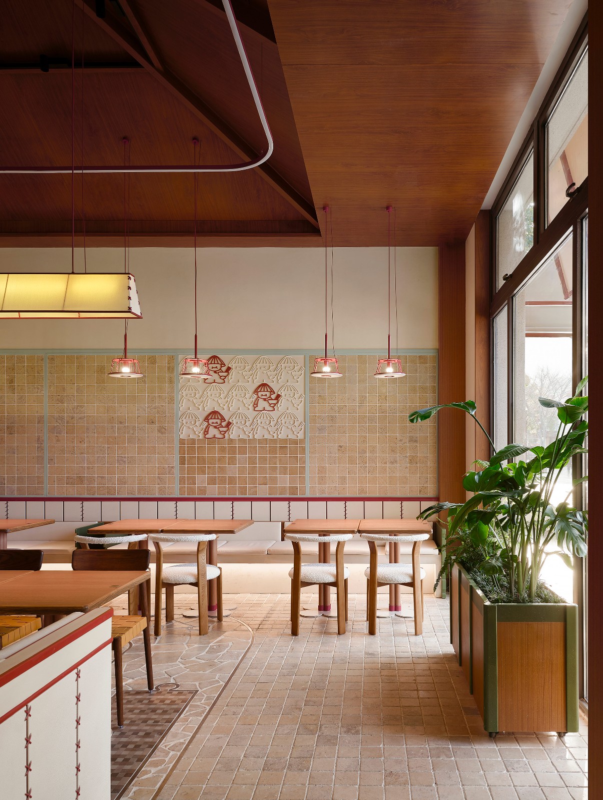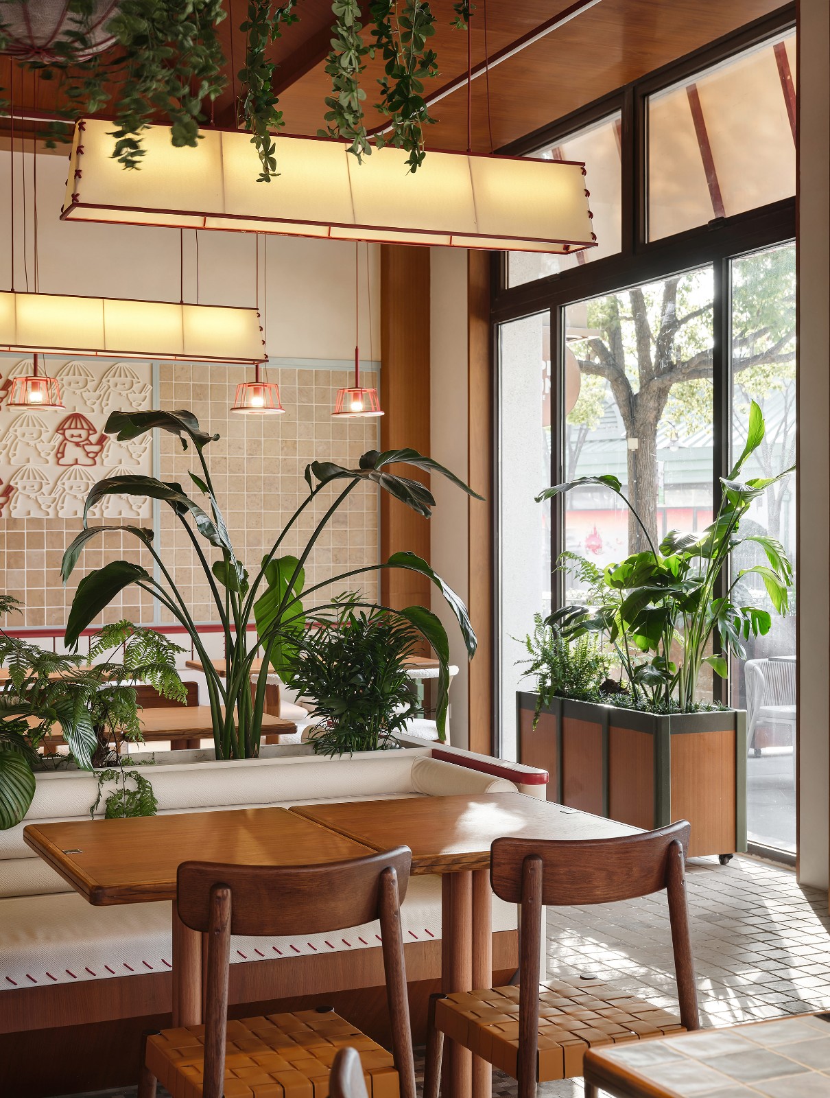 Lighting Design: Woven ribbon chandeliers guide the visual flow, while pinpoint spotlights above the banquettes cultivate a warm ambiance. Timber tones and verdant greens compose a relaxed yet vibrant spatial palette. The multi-layered lighting collectively fosters an immersive dining experience.