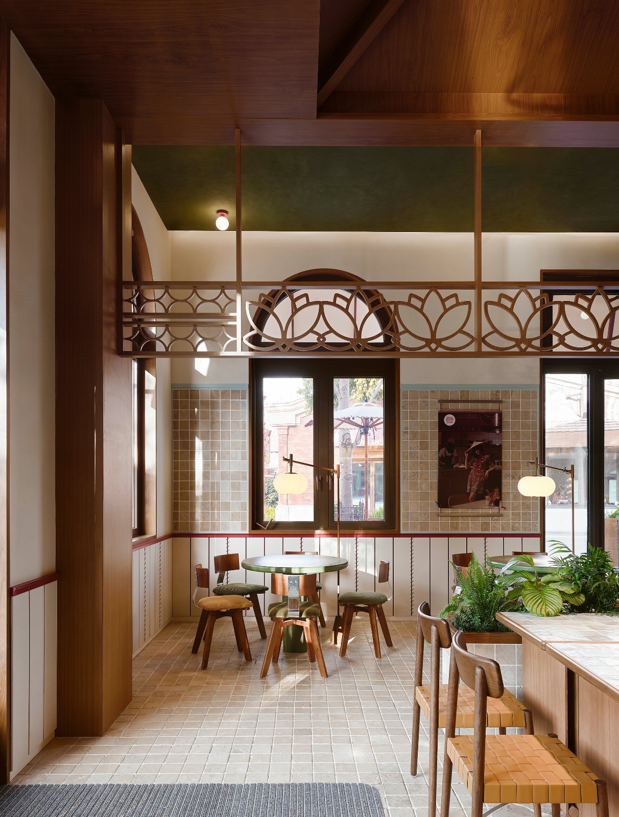 灯光设计上,序列感的织带吊灯引导视觉,卡座上方的点状灯光渲染温馨。木质与绿调铺陈出松弛而鲜明的空间。多层次的照明共同营造出沉浸式的用餐场景。