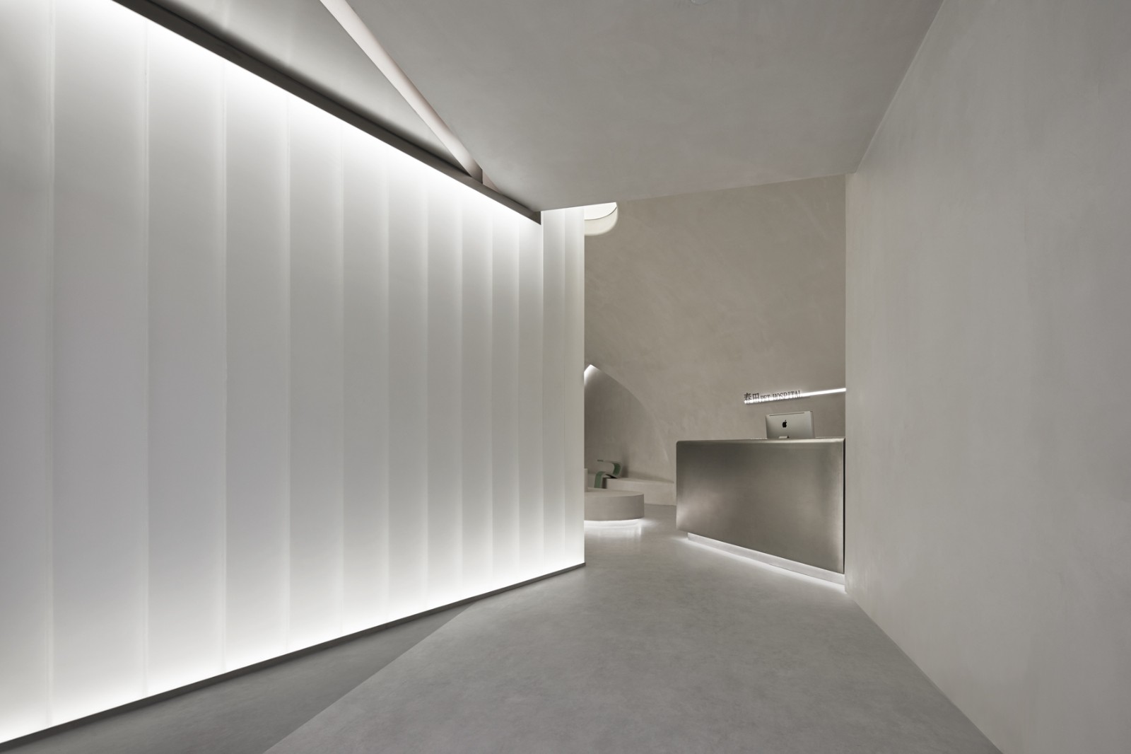 We placed a "light box" surrounded by U Profiled Glass along the vertical direction of the entrance. This gives the space a transparent and closed character. At the same time, the light box of the clinic occupies the central part of the space and defines the left and right parts. One side is the professional diagnosis and treatment area of the pet hospital, including the central disposal area, operating room, UR room, etc. On the other side is the waiting area focusing on customer experience.As a place to reflect professionalism, we adopt the form of square boxes. Also, using the U Profiled Glass to project soft neutral light, we create a modest and calm atmosphere.
