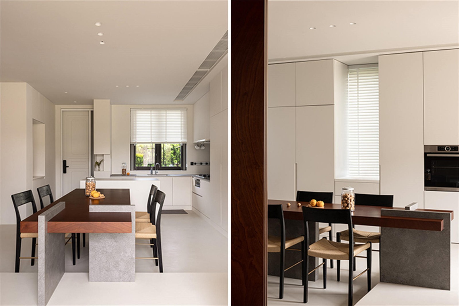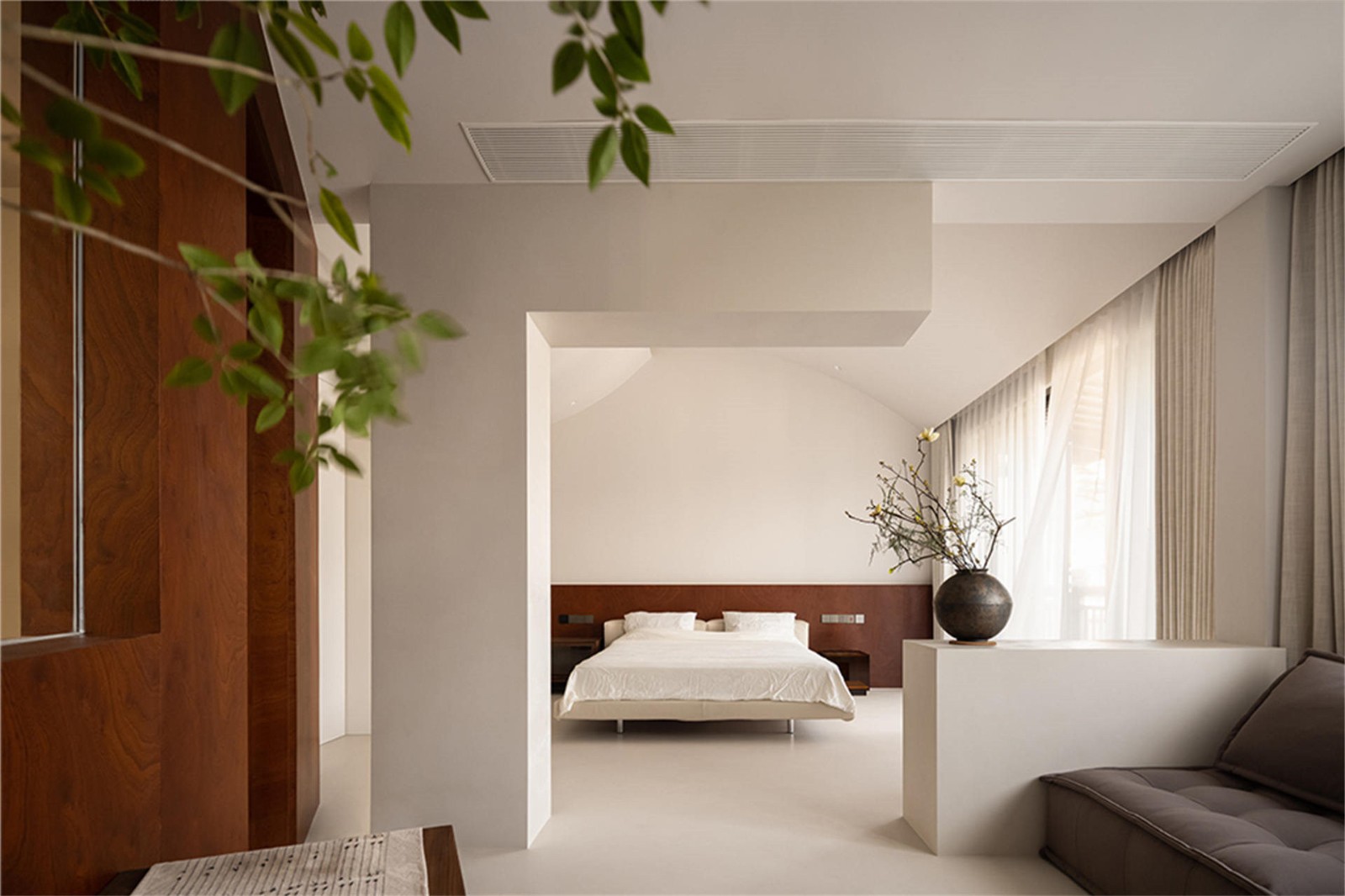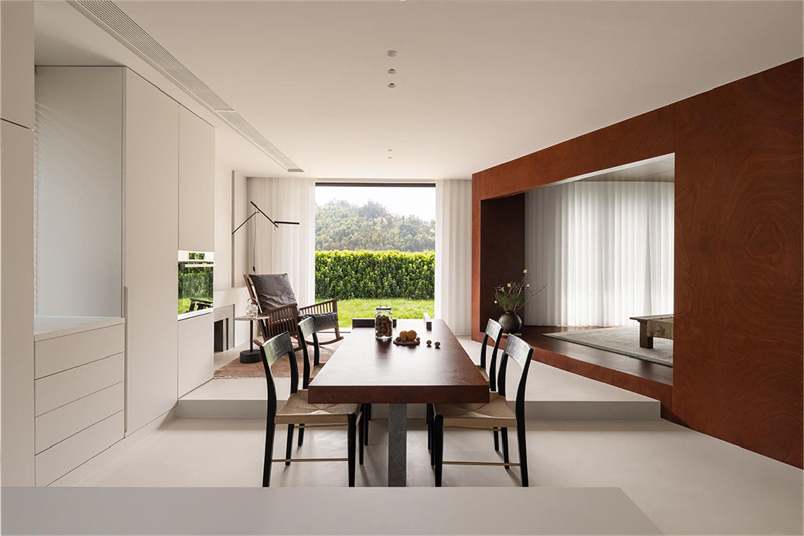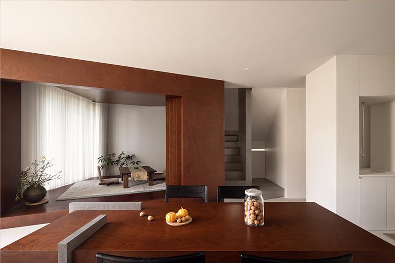 进入室内,我们用递进抬高的形式对空间进行软分割,营造专属于这个家的节奏感。从入户玄关到灰空间,“拾级而上”的动线也为回家这一动作增加了仪式感,开放的自然景观面,让室内外空间浑然一体,徐徐清风贯穿南北,无论身处餐厨、休闲区都可以将自然美景一览无余,人的心境也在空间里放松下来。卧室区域有一根承重柱和配重梁,为了弱化此处梁结构,使其发挥最大功效,我们以配重梁为基础向上拉伸,和侧边承重柱结合形成“L”形框架,可用于置物、书桌等功能;另一侧是与其呼应的倒“L”形造型,两者结合演变为“室内取景框”,将二楼卧室做半开放分割,合理划分出起居小客厅以及休憩区域。