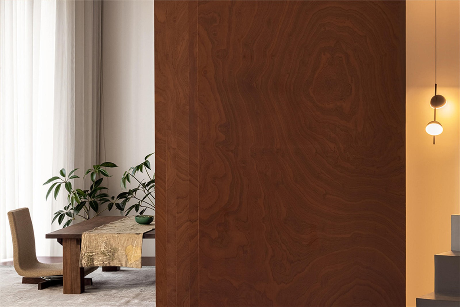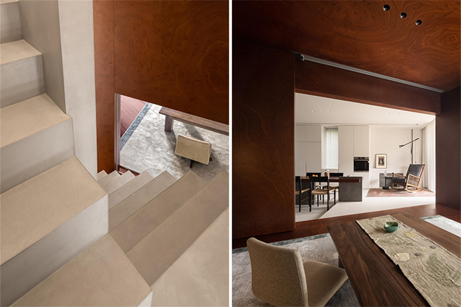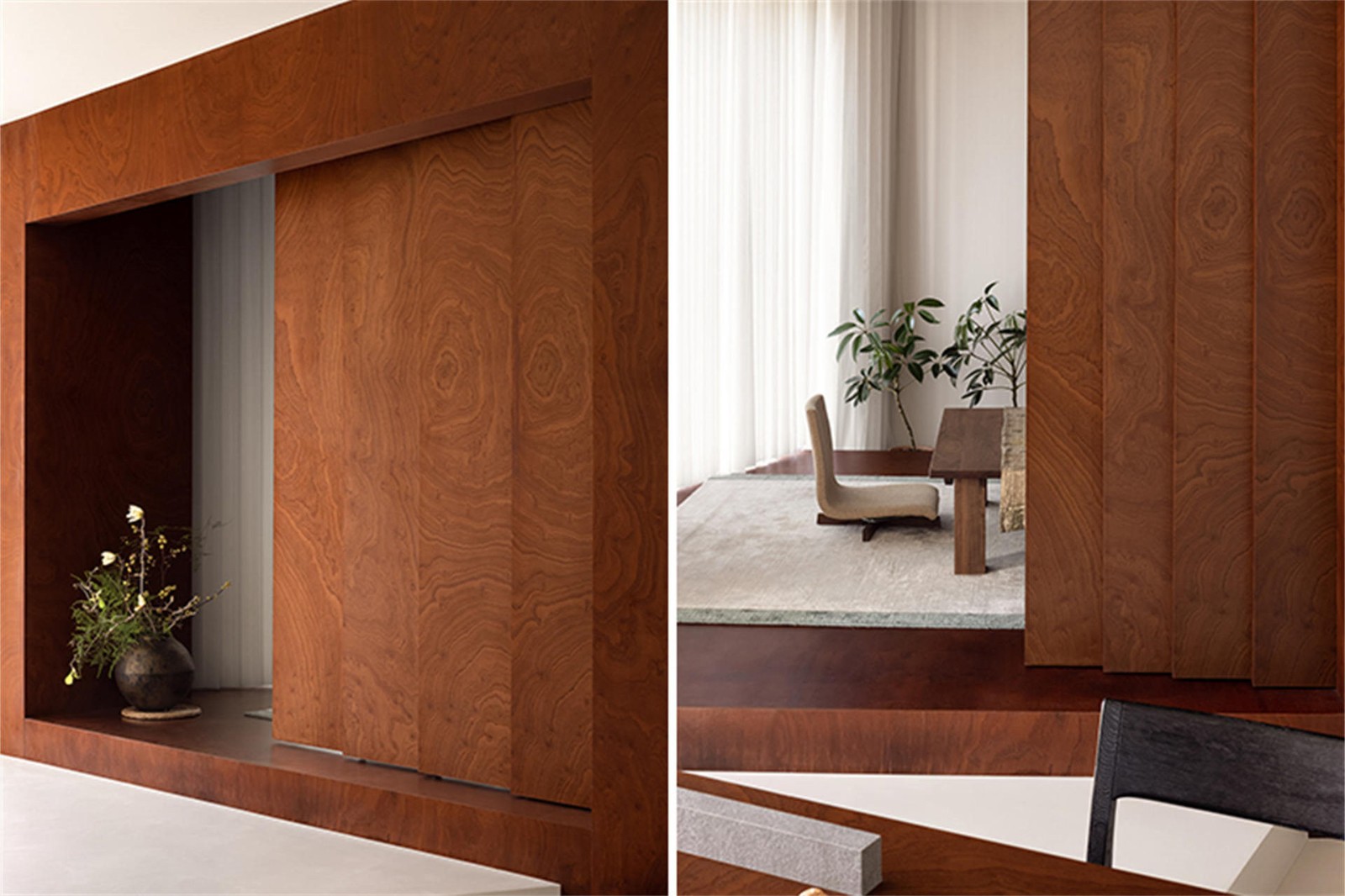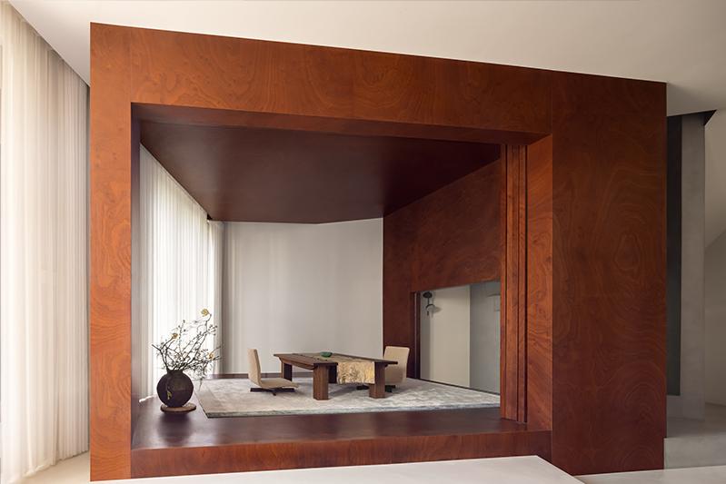 这栋住宅坐落在距杭州一小时车程的莫干山脚下,是为一对退休夫妇所建造。原生山林、溪谷、茶园环绕,日间阳光从北面穿过窗帘洒入室内,缔造了独属于这栋住宅自然惬意的空间氛围。业主二人对新事物的接受度较高,于是我们做了很多打破常规的设计,让他们能够更好地享受这山水之间的闲情生活。一层空间原始布局较为常规,我们将灰空间旋转一定角度后,得到一个非常规的斜向盒体。女业主热爱自然,绿植是这个空间中贯穿主线的视觉要素,盒子的三个立面通过吊轨移门、玻璃最大程度的敞开“引景入室”,旋转后形成的夹角空间放置绿植做点缀,楼梯处夹角竖向贯穿,作为室内小天井存在,引入部分天光后再身处灰空间,仿佛置身自然。观景盒子由桃木芯饰面包裹,木头的独特纹理天然不造作,赋予空间温润的氛围。同材质的吊轨移门让灰空间与一层其他空间实现交互。内部则是榻榻米形式,榻榻米地面一直延伸到庭院里,空间作次卧用时,重心降低的感觉搭配淡淡的木质香,清心助眠,下方加入储物功能,增加了收纳空间。