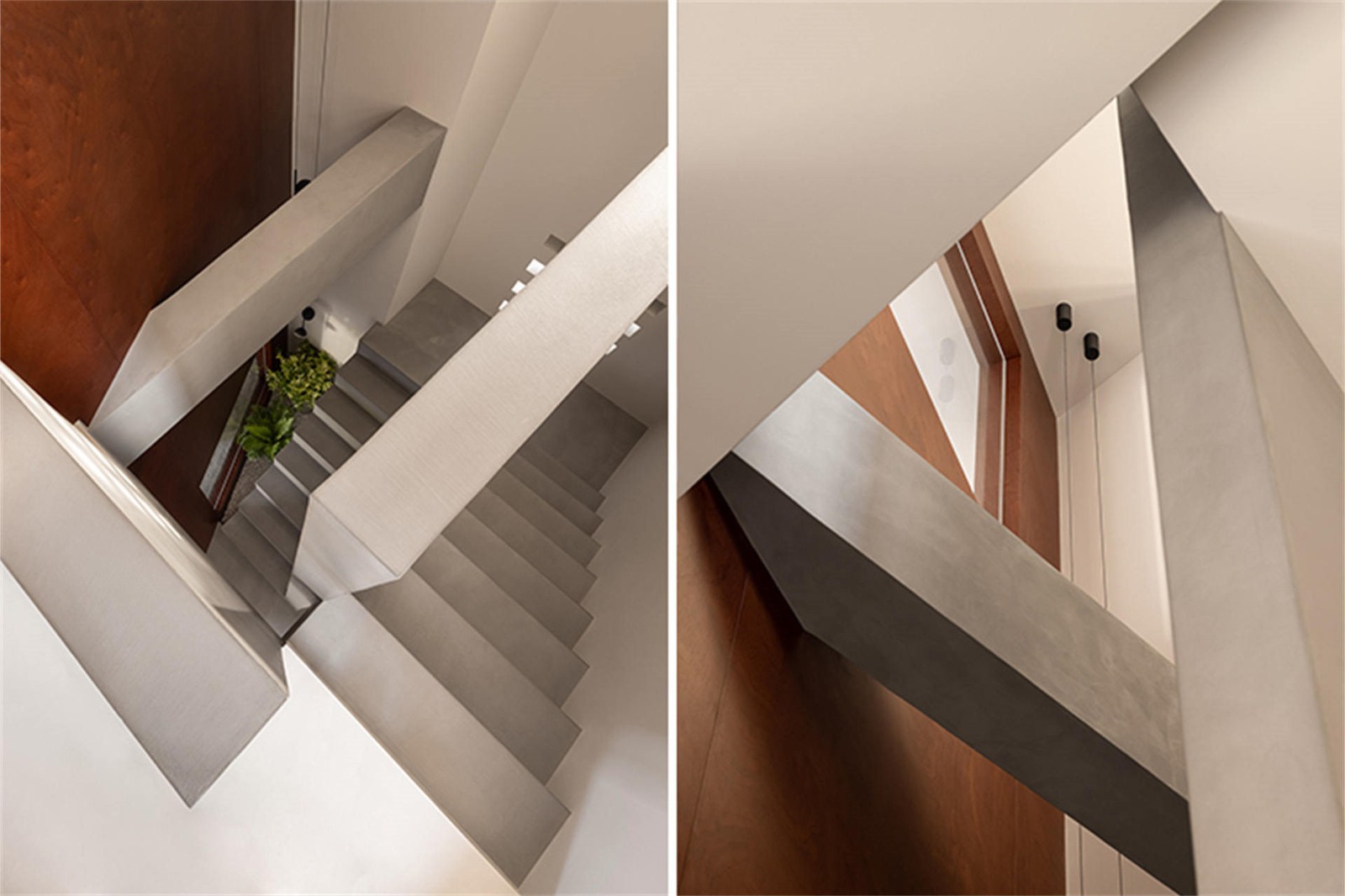 The house is north-south, and the east side of the stairwell is unshielded. The first impression of entering the original space is that the stairwell is particularly well lit. We take advantage of this space to open an array of square holes in the outer window to light the entrance. The light changes with time, creating a unique natural landscape in the home. At the same time, some of the light passes through two Windows in the facade to provide daily lighting for the grey space on the first floor and the living room on the second floor.We exposed an original ring beam in the staircase space and rearranged the relationship between the staircase and the structure. Looking down from the second floor, the beam structure uses the height difference to naturally divide the stair space. The surface of the beam is treated with micro-cement, which is consistent with the overall material of the staircase.Underneath the stairs is a hidden mini-space with a hidden electric box that can also be used as a cat house and storage room. The door panel is opened with a "one" notch for the handle. The light shines through the handle, bringing a touch of dreamy color to the otherwise dim corner.