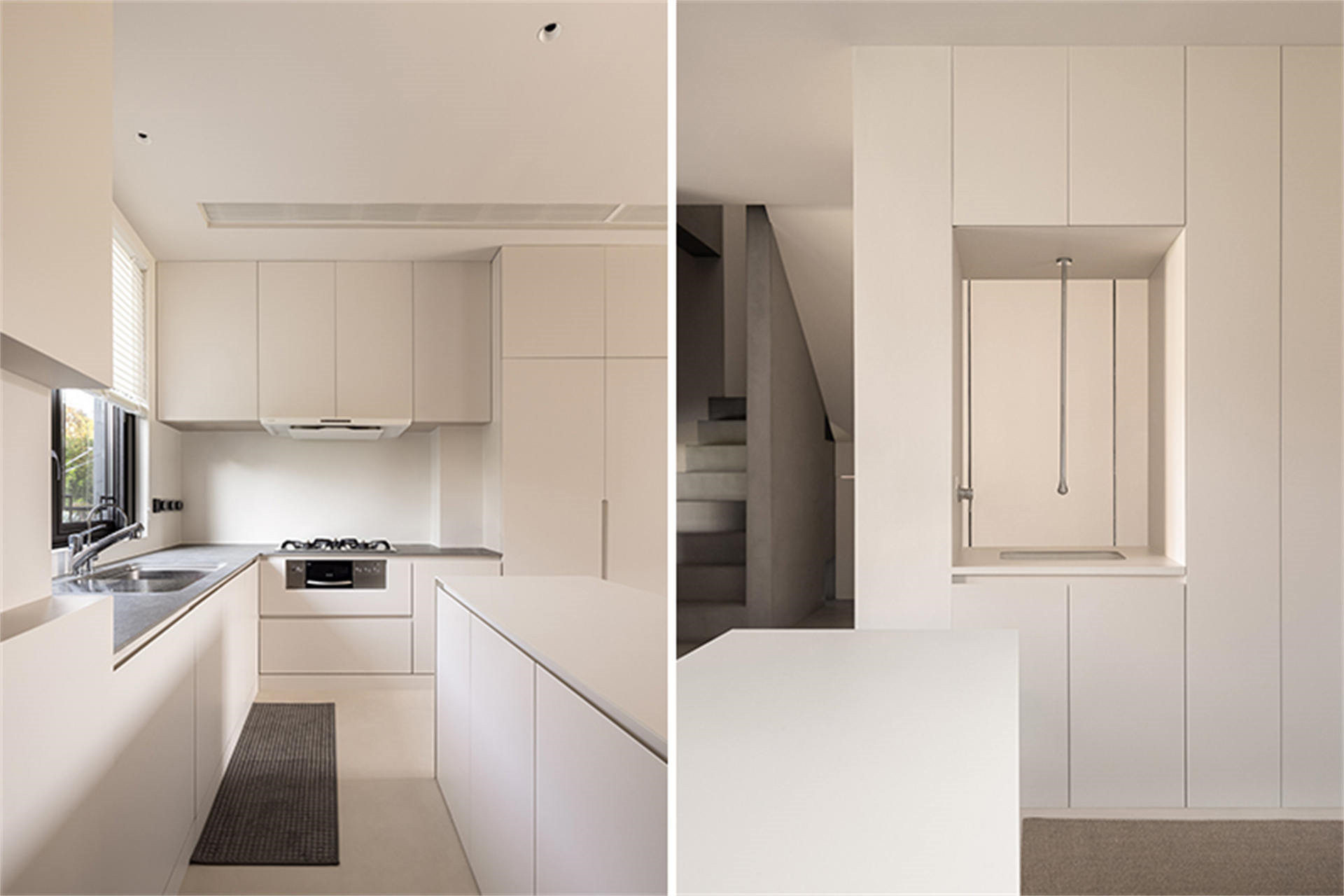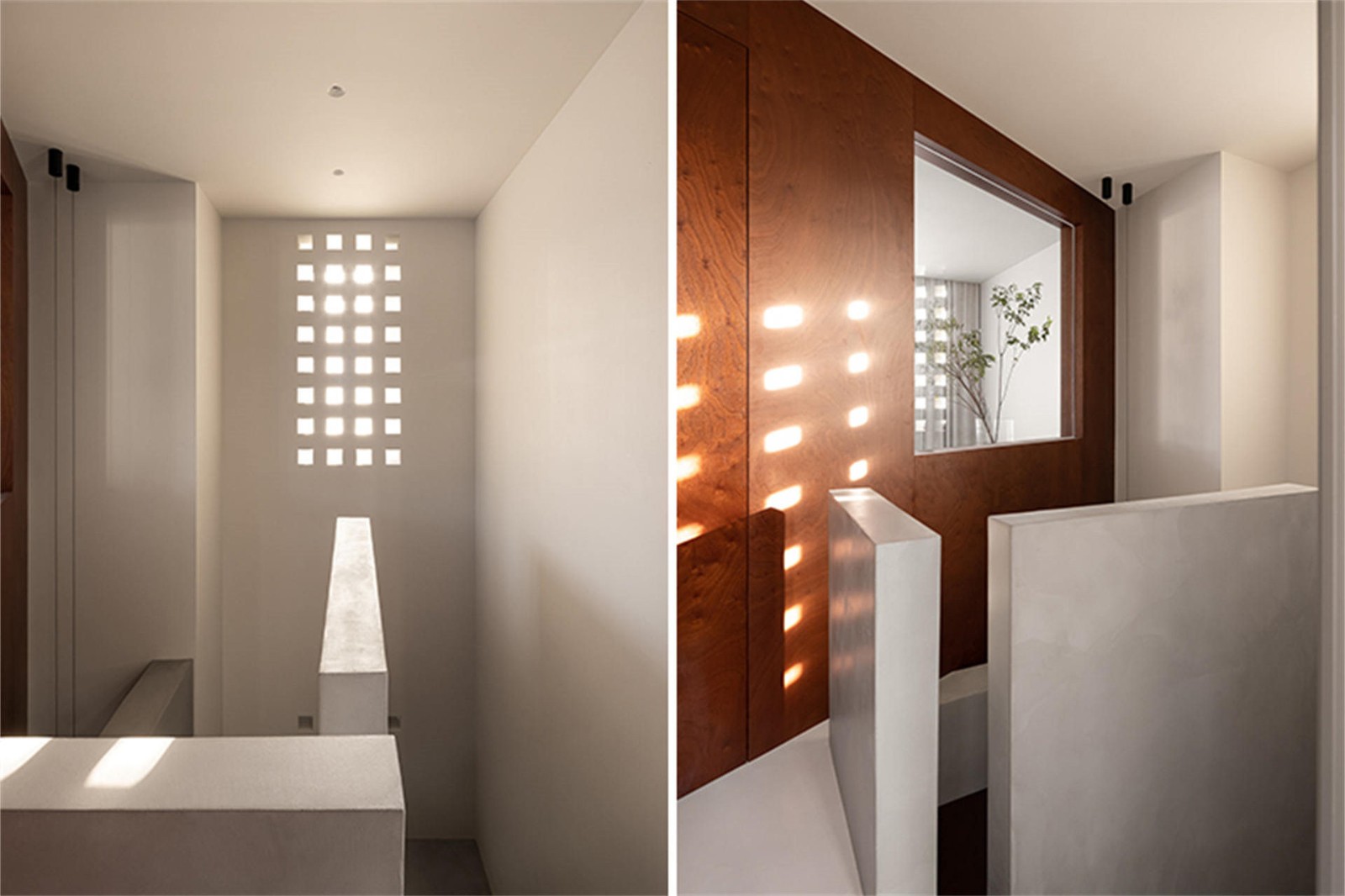房子是南北向,楼梯间所处的东面外部无遮挡,进入原始空间的第一感觉便是楼梯间采光特别充足,我们借这一空间优势在外窗处开了阵列式方孔来引光入室,光线伴随时间发生变化,在家中形成独特的自然景观。同时,部分光线通过立面的两扇窗分别为一楼的灰空间、二楼的起居室提供日常照明。我们将楼梯空间的一根原始圈梁裸露,重新梳理楼梯与结构的关系,由二楼向下看,梁结构利用高低落差将楼梯空间自然划分,梁的表面做了微水泥处理,与楼梯整体材质统一。楼梯下方隐藏了一个迷你空间,内部隐藏电箱,也可作猫屋和储藏室,门板开“一”字形缺口做拉手用,光线透过拉手,为原本逼仄昏暗的角落带来了一丝梦幻色彩。