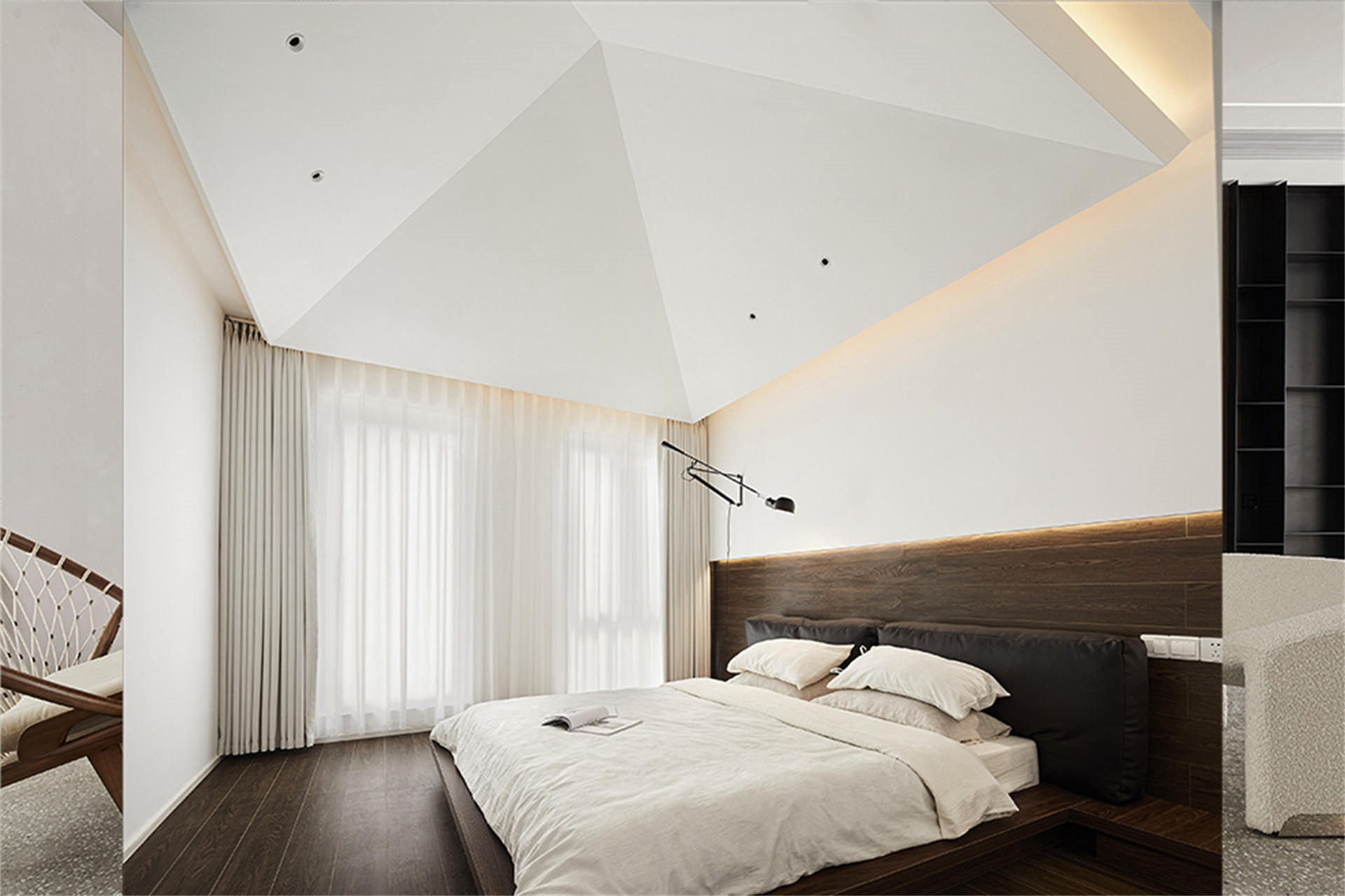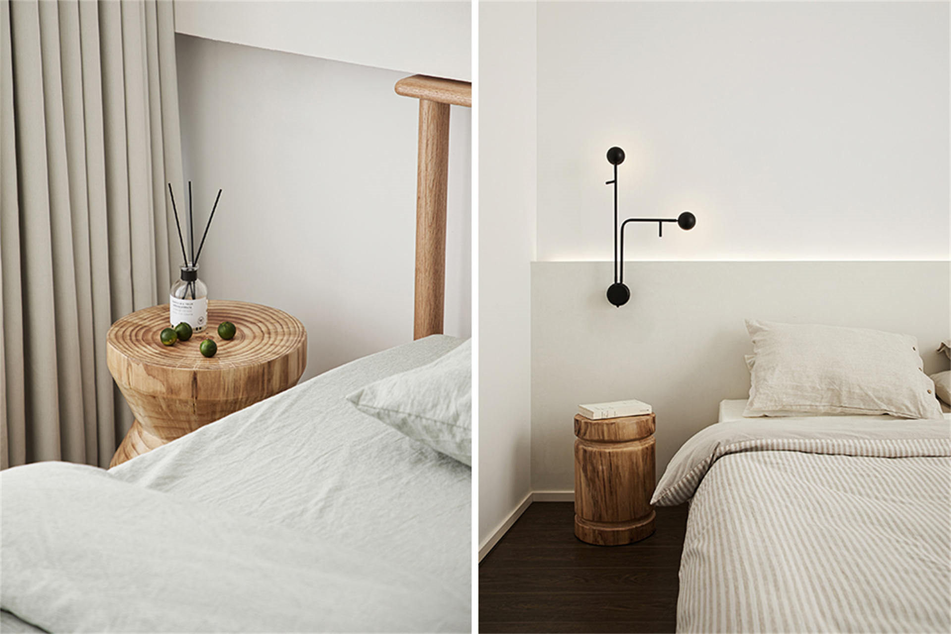 The second and third floors are bedroom rest areas. We hope to be reasonable and calm, and return to the natural life to ensure the maximum comfort of each room. The furniture is in a natural log style, mostly curved, and the bedding is also made of linen, and the color should be light as possible. When you enter the bedroom, you need to take a good rest, and the inclusive space can relax faster. Most of the lamps in each room are indirect light, and the light reflected twice can effectively prevent the glare problem and create a comfortable atmosphere for sleeping and resting. Each bedroom room has storage cabinets, and the design of the top-level cabinets is designed to expand the storage area to the largest extent. At the same time, the built-in wall cabinets will visually make the home more tidy. There is a sensor light in the cabinet, which is bright whenever the cabinet is opened. The third floor is the master bedroom area. The space is designed as a large suite with a bathroom, study, dressing table, bedroom and balcony. The theme of the third floor is the comfortable holiday style. The suite that can only be experienced when playing outside is moved to the home, giving the family A new life experience. The sloping roof of the bedroom is inspired by the enclosed space of thatched cottages in Southeast Asia, which subtly blends the exotic style into the minimalist shape.
