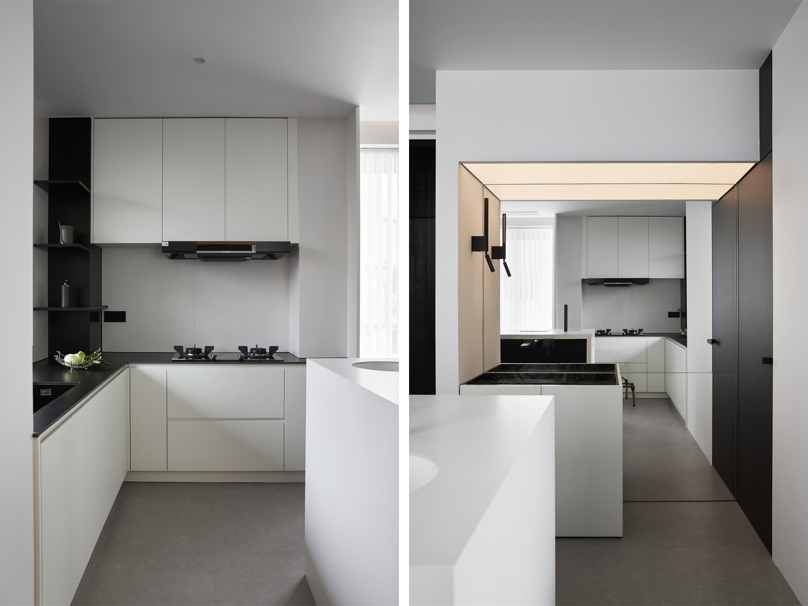 Since the client uses the kitchen space less frequently, we made an "L" shaped open kitchen around the wall. The guest kitchen space is distributed around the whole long hall, and the whole space is bright and transparent.Basin area was originally dark area, no light. We chose a uniform light film as the top, full of atmosphere.The eye-catching "C" shaped basin area with the external form combined with the whole mirror magnifies the visual space. The wood marble material blends well with the overall space style.