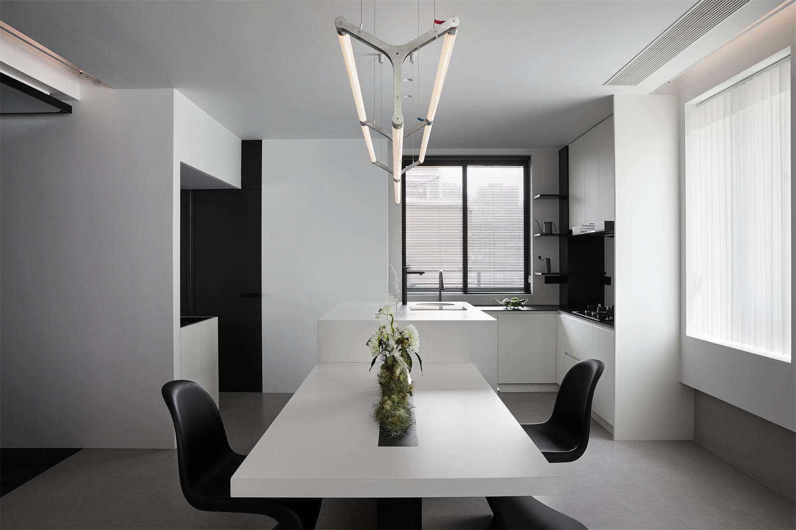 Our pioneering vision for this home is also reflected in the combination of artistry and hardwear. Facing the restaurant, we made a painting covering the whole wall with paint. The texture of the paint was rough and textured. Uneven white dots were added to the large area of black, and the points of light seemed to blossom in the chaos.The aesthetic interest of the inhabitant is the soul of the home. According to the client's requirements, we combined black and white blocks to form an "origami island". The island layout and the table form a "face" type structure, and the height distinguishes the preparation area and the dining area. The island is equipped with multiple functions such as lifting socket, wireless charging, embedded induction cooker, and under basin to meet the daily needs of two people.