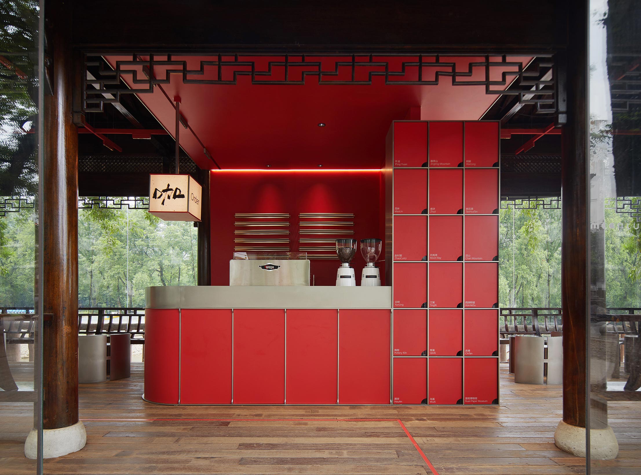 The straight-line distance between the pavilion and the main road is about 14m. On the ground, we use the river shape in Moon Bay as the path guidance to connect the road, square and pavilion, and add the details of red brick and embedded ground lamp, making the path to the pavilion clearer.The design inspiration of tables and chairs comes from the changes of the lunar phase, and the chairs can be freely combined or split to adapt to different scene needs. The table number is also named after the phases of the moon, echoing with the store name “MOON CUP”.As the side view, the exterior red wall separates the pavilion from other businesses in the square. Its form follows the windowing design of the internal check in wall, which allows our sight lines to penetrate freely to alleviate the occlusion feeling brought by the solid wall. The shop sign of the coffee cafe in the pavilion is designed above the slopping roof, echoing with the multi-functional bar, creating a visual effect that the space breaks through the shackles.Our design made the pavilion become a new landmark of the Moon Bay scenic area. Staying in the pavilion, or sitting under the eaves, together with the pavilion, the residents and tourists can come here to feel and appreciate Xuancheng, a city with four distinct seasons.