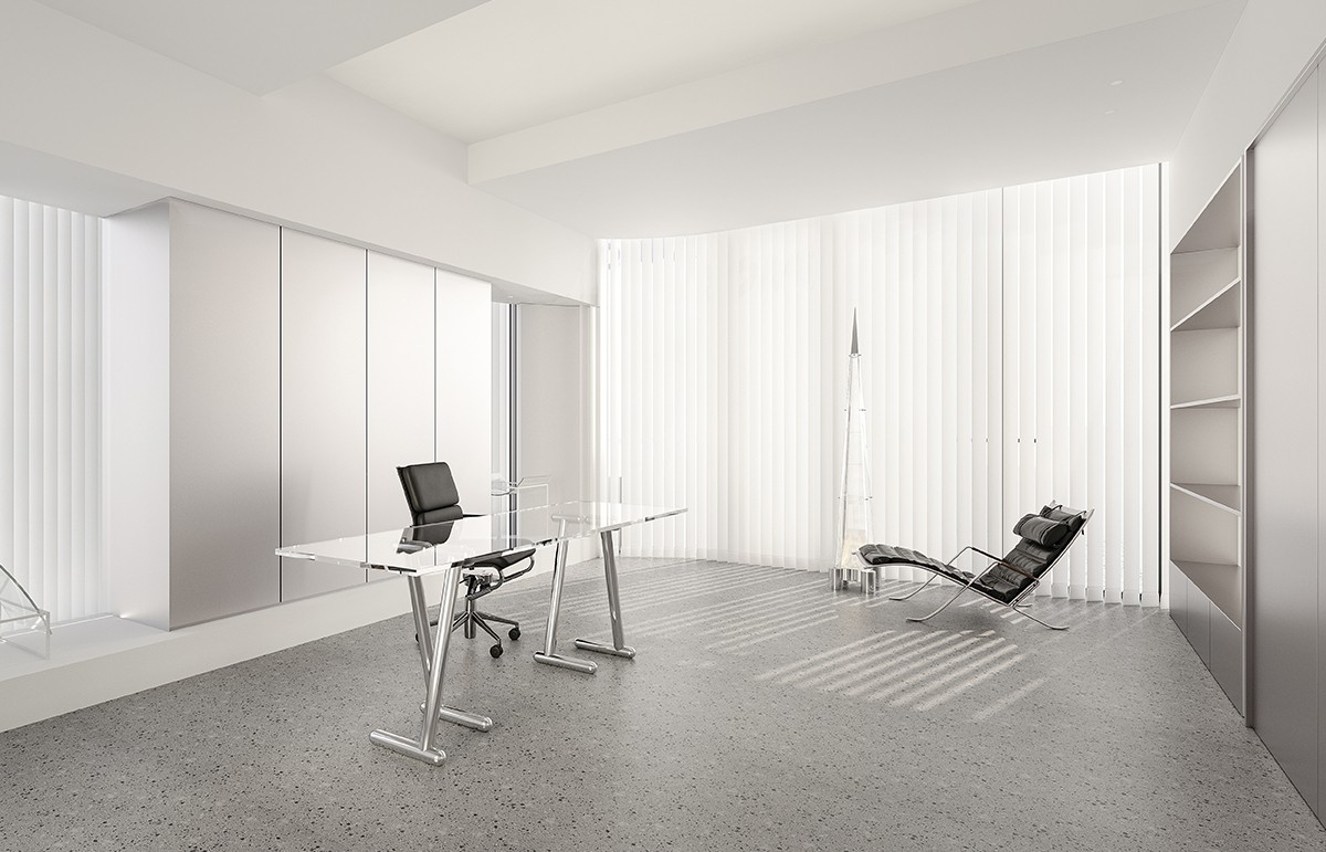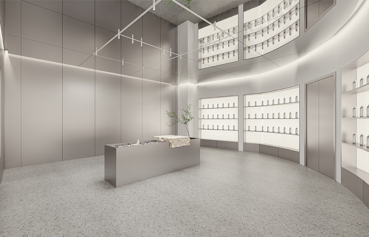 A large number of exhibits are placed in the "selection area". Considering the rich colors of the products in the later period, the overall space is simple and clean. The sense of sequence is combined with the mirror on the top to make the space experience more shocking;The materials of the general manager's office are consistent with those of other Spaces. Simple and clean materials are selected. The two pillars and pipes behind the desk are wrapped with cabinets to make the space more cleanly integrated.The elevation of the floor and the coordination of the light make the back of the cabinet form a display window;