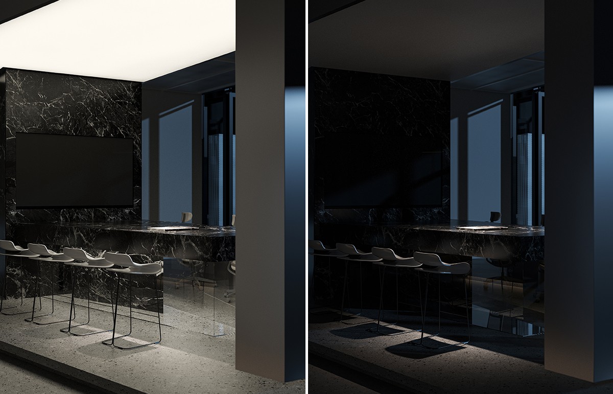 接待台与休闲区位于整个动线的最末端,员工通过休闲区的走道进入办公区,与客户参观动线区分开,接待台设置在此处,与门厅只有一墙之隔,方便前台员工进入接待客户,开敞的空间也让整体氛围更加轻松灵动;办公区是项目中占比最大的空间,在中央区域我们置入了倾斜的岛台,此处兼具了洽谈、展陈、员工会议与头脑风暴;灯光膜吊顶及地面抬高延续了反重力设计,在吧台台面选用了石材,底部使用透明亚克力,营造悬浮感兼具产品展示的功能;