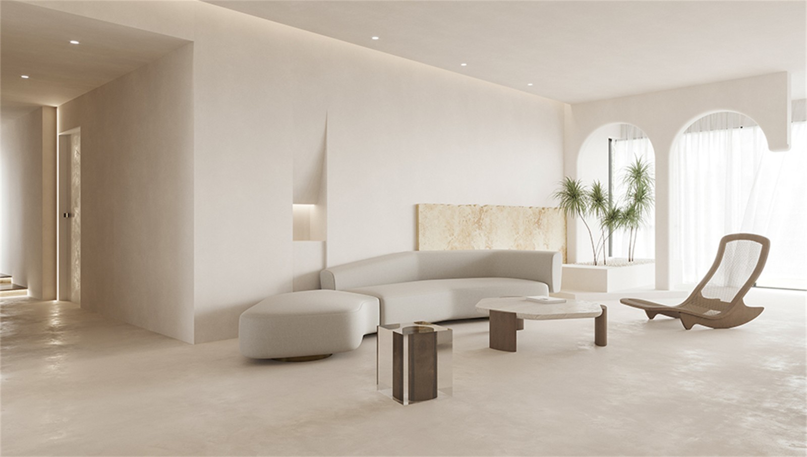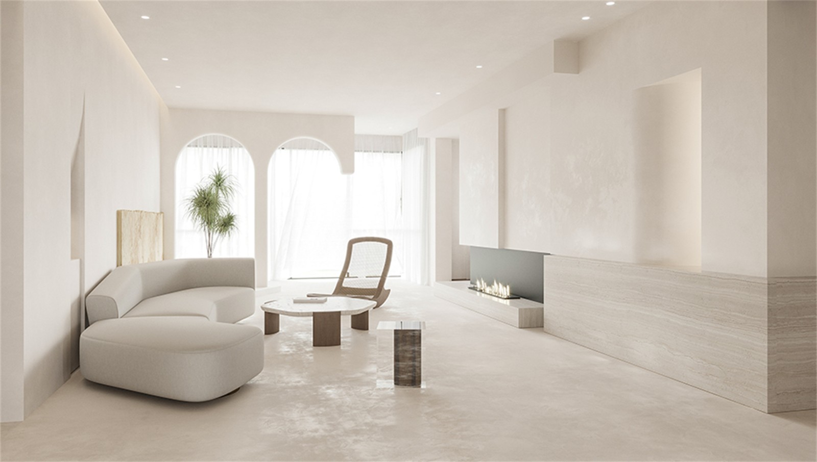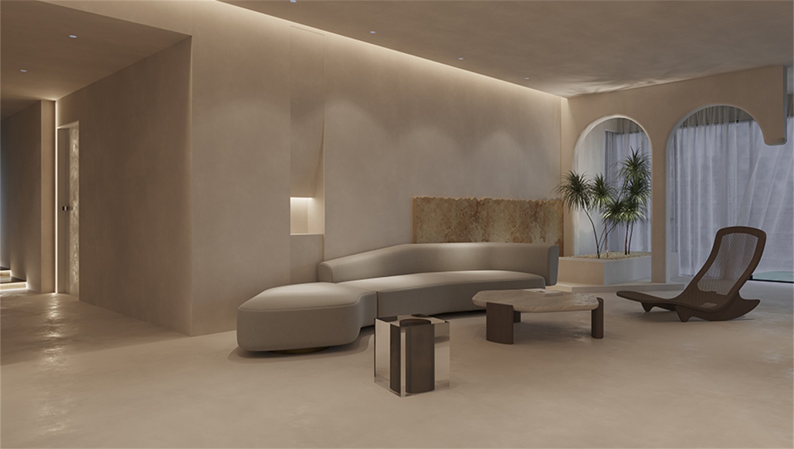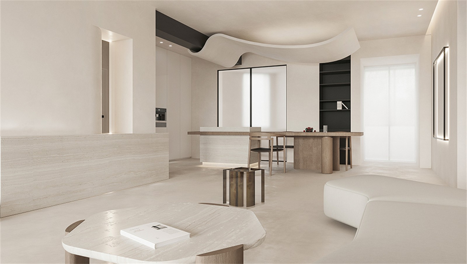 粗糙硬朗的石材与温柔的弧线造型理性与感性的交叠共生
