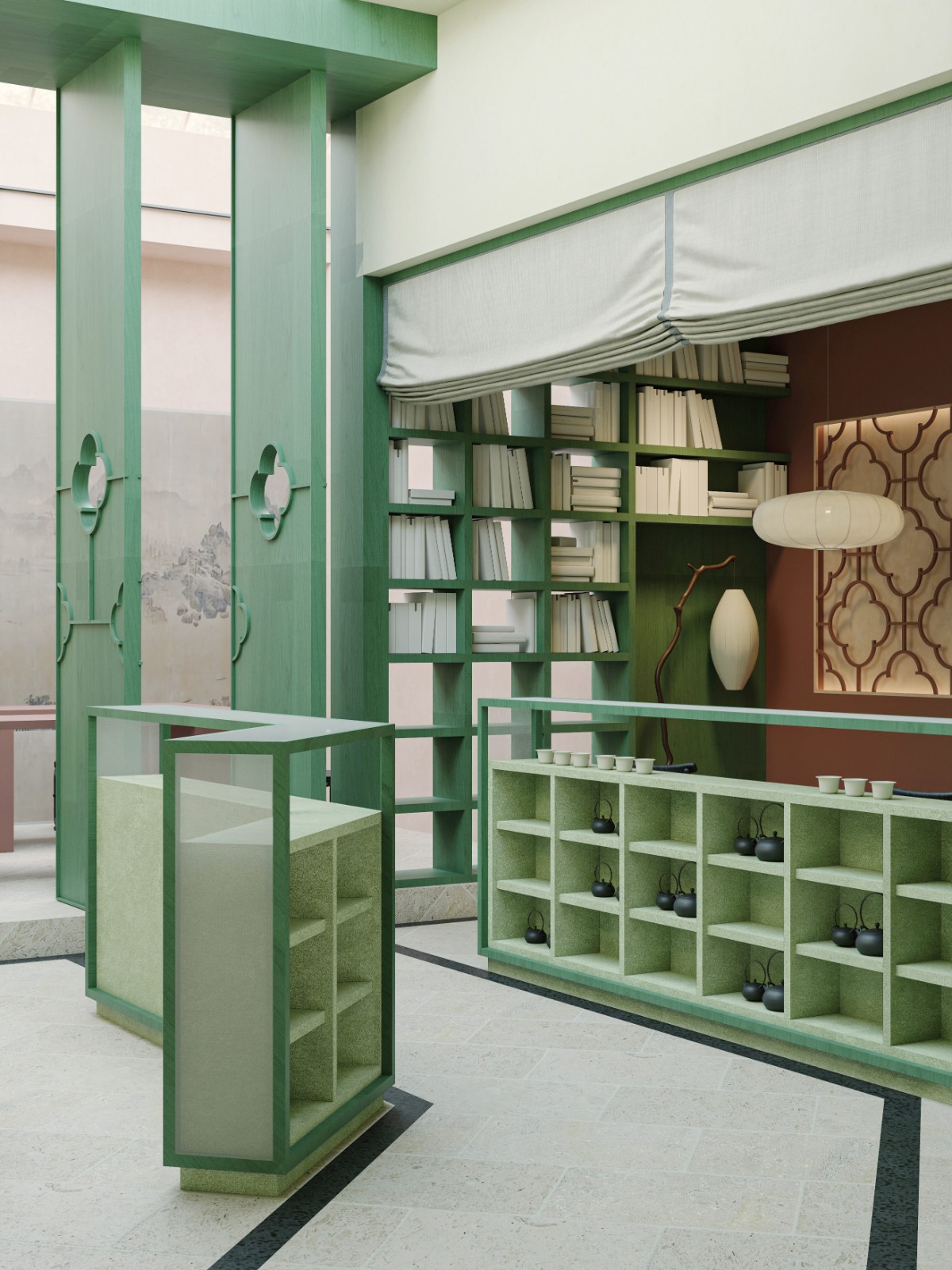 Extracting the Ruyi window lattice motif from classical Chinese gardens for spatial elements: the bar counter features a window lattice with a plantain, creating a framed view that evokes a living scene; the seating area is divided by vertical elongated windows to cultivate a meditative tea-drinking atmosphere. Additionally, the hollowed Ruyi pattern on the green door in the guest area and the pink-and-green Ruyi motifs adorning the tea tables echo the "Window Lattice Elegant Gathering" theme.