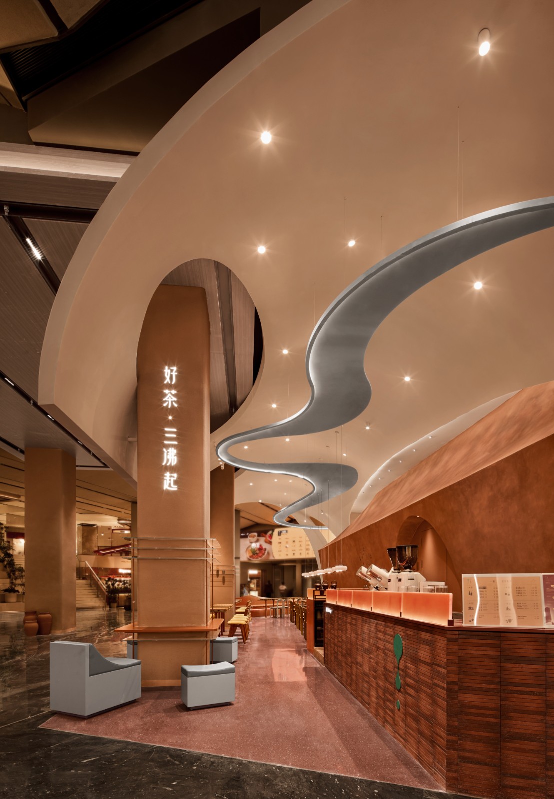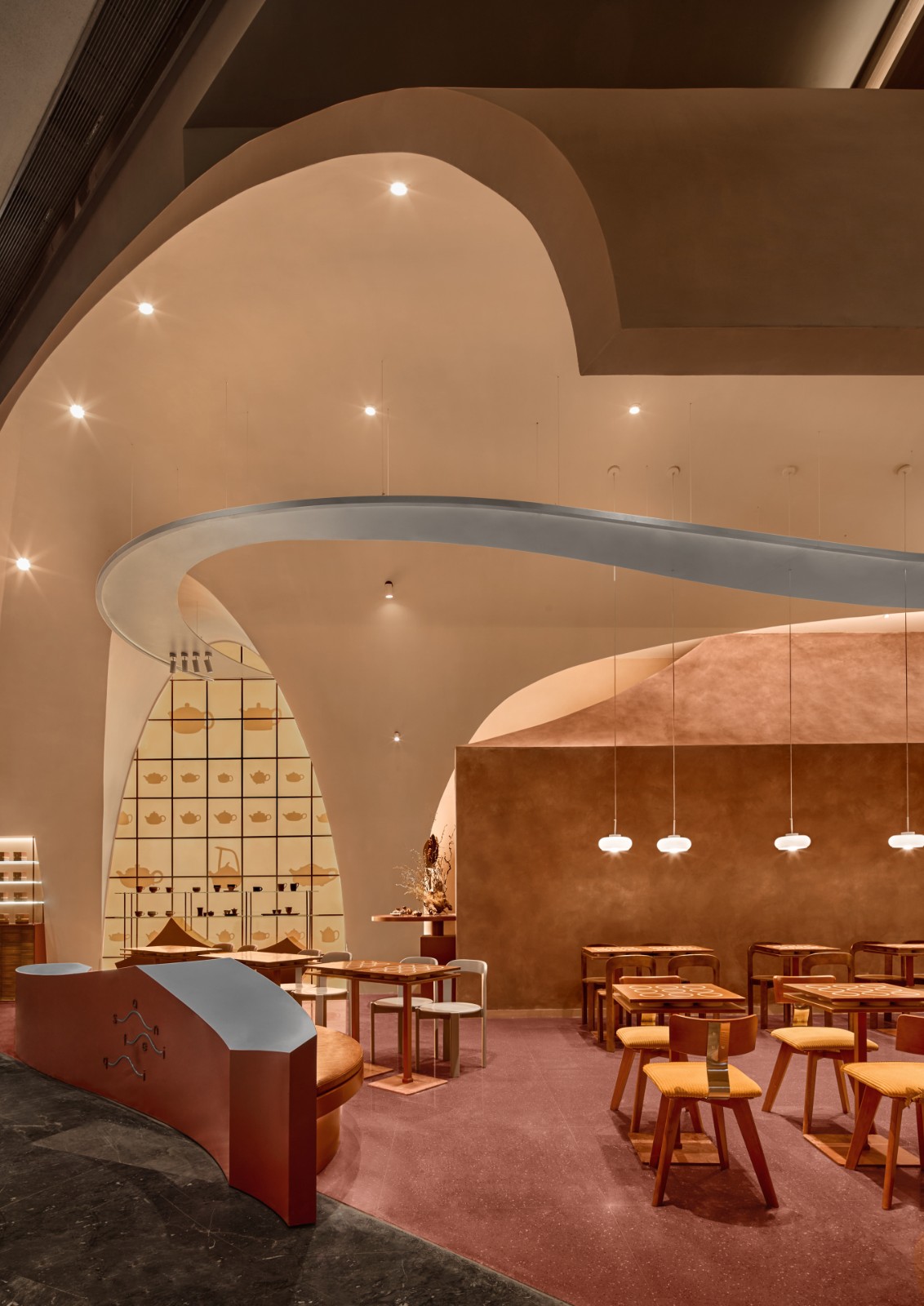 Drawing inspiration from the local culture of Yixing—including the Dragon Kiln site, traditional kilns, and the intangible cultural heritage of Yixing purple clay teapots—the design integrates these elements into the space. The irregular curved ceiling evokes the form of the Dragon Kiln, while the bar counter serves as a translation of the kiln structure. Silhouettes of purple clay teapots are featured on the walls, weaving the region's cultural heritage into the spatial experience.