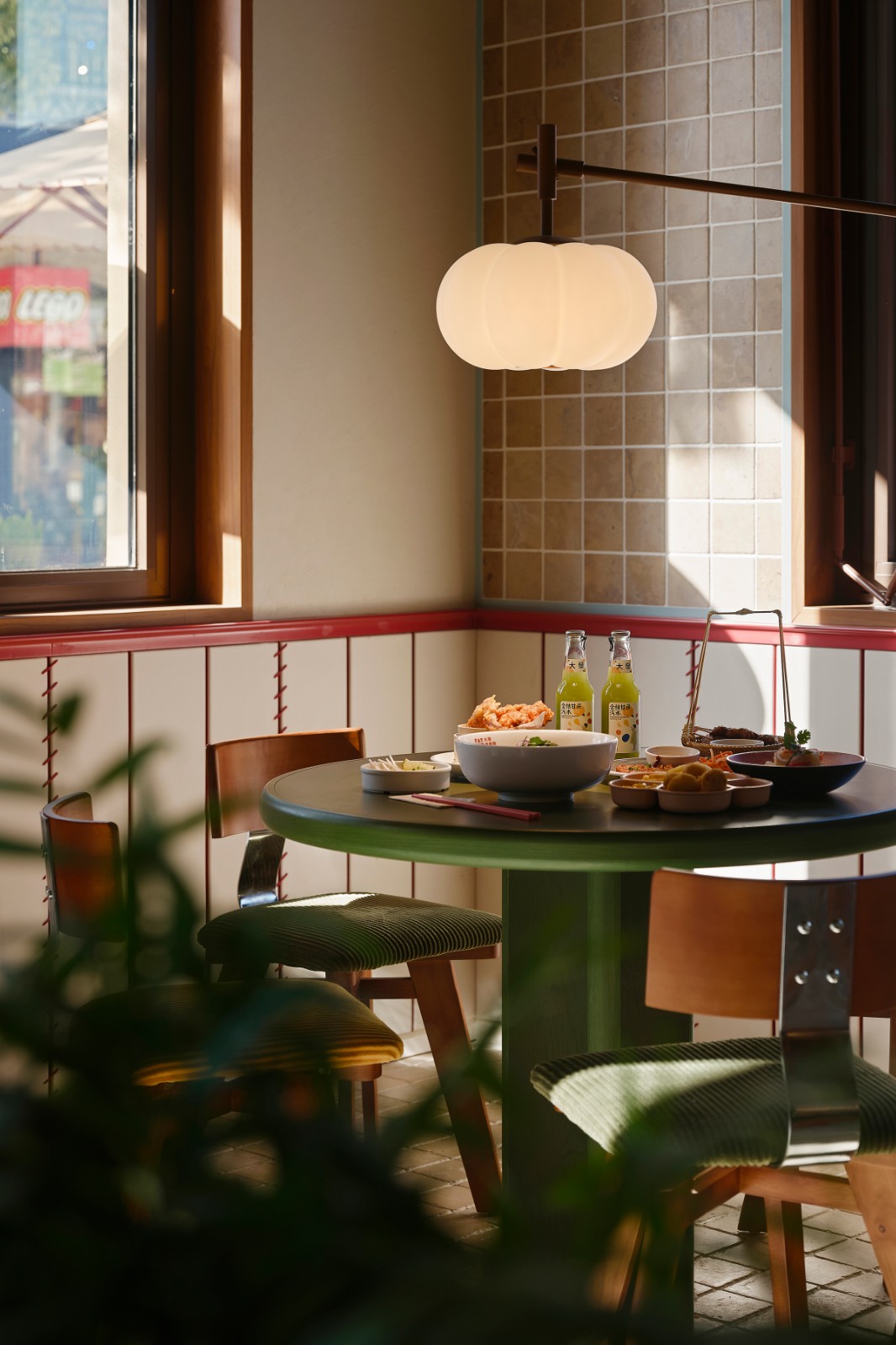 Lighting Design: Woven ribbon chandeliers guide the visual flow, while pinpoint spotlights above the banquettes cultivate a warm ambiance. Timber tones and verdant greens compose a relaxed yet vibrant spatial palette. The multi-layered lighting collectively fosters an immersive dining experience.